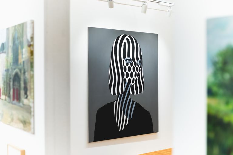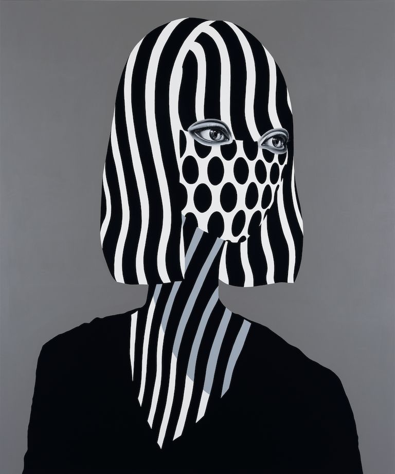 A portrait is a depiction of a specific individual, which became an established style of painting during the Renaissance. Since then, many artists have created portraits with a wide variety of themes. Some portraits have pursued realism while others have emphasized the beauty or exaggerated the ugliness of their subjects. In the past, the creation of a portrait typically required the artist and subject to be face-to-face, but in Portrait of dazzle, neither the artist nor the subject know who the other is (and in this case, the subject is not even aware that they are a subject of a portrait). In this series, portraits of the modern person are created from the countless photos of faces posted online by tracing and projecting the eyes onto a dazzle camouflaged* silhouette of a person whose race, sex, hairstyle, or body shape differs from that of the original subject.
