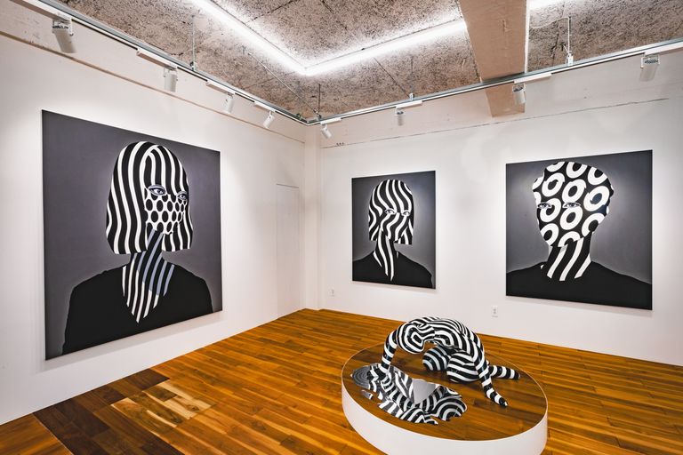 肖像画は絵画のひとつのスタイルとして確立したルネサンス期以降、画家たちによって様々なテーマで描かれてきました。写実性を追及した肖像画もあれば、極端に美化された肖像画や逆にわざと醜く描かれる肖像画もありました。古くから肖像画の制作においては、画家とモデルが対面し制作するのが一般的ですが、作品《Portrait of dazzle》では、画家とモデルはネットを介して、お互いに面識がない状態で(モデルにおいては自信が描かれていることも知らない)肖像画が制作されます。この作品は、SNSに投稿された無数のセルフィーやスナップなどの顔写真から、ビデオプロジェクターを使い「目」だけを正確にトレースし、目以外の部分はモデルとしたSNS上の人物から、人種や性別、髪型、輪郭などを別の人間に描き変え、体の一部または全体を白黒のダズル迷彩※で塗りつぶした「現代人の肖像画」です。